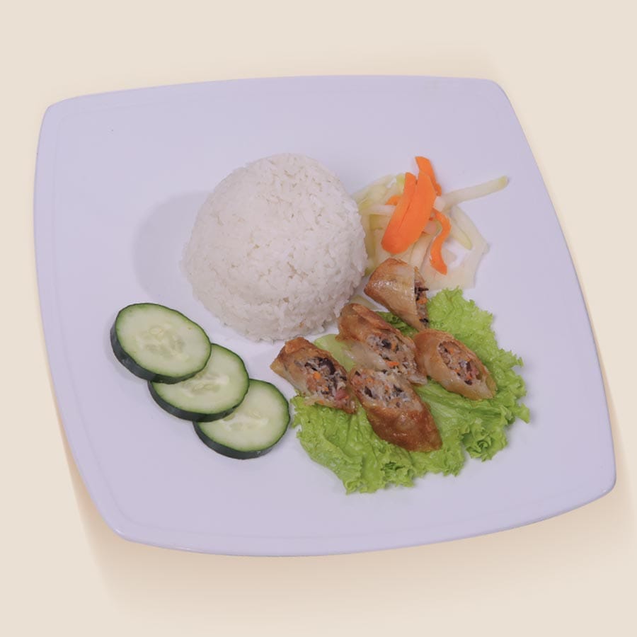 Crispy Vietnamese fried spring rolls served with steamed rice, fresh herbs, and dipping sauce. Authentic Nem Ran rice meal in Manila at So Mot.