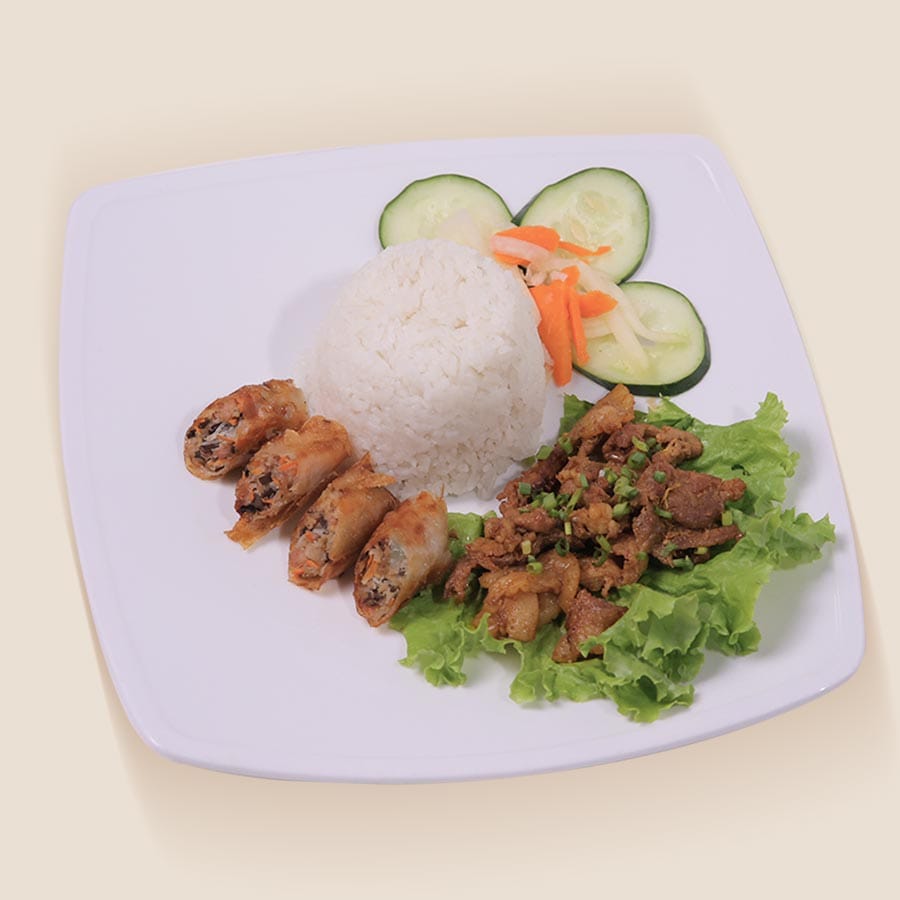 Experience the best of Vietnamese flavors with our Pork BBQ & Fried Rolls Rice. Juicy grilled pork slices marinated in lemongrass, garlic, and honey are paired with crispy fried spring rolls (chả giò) filled with minced pork and vegetables. Served over warm jasmine rice with pickled veggies, fresh herbs, and our signature fish sauce dip.