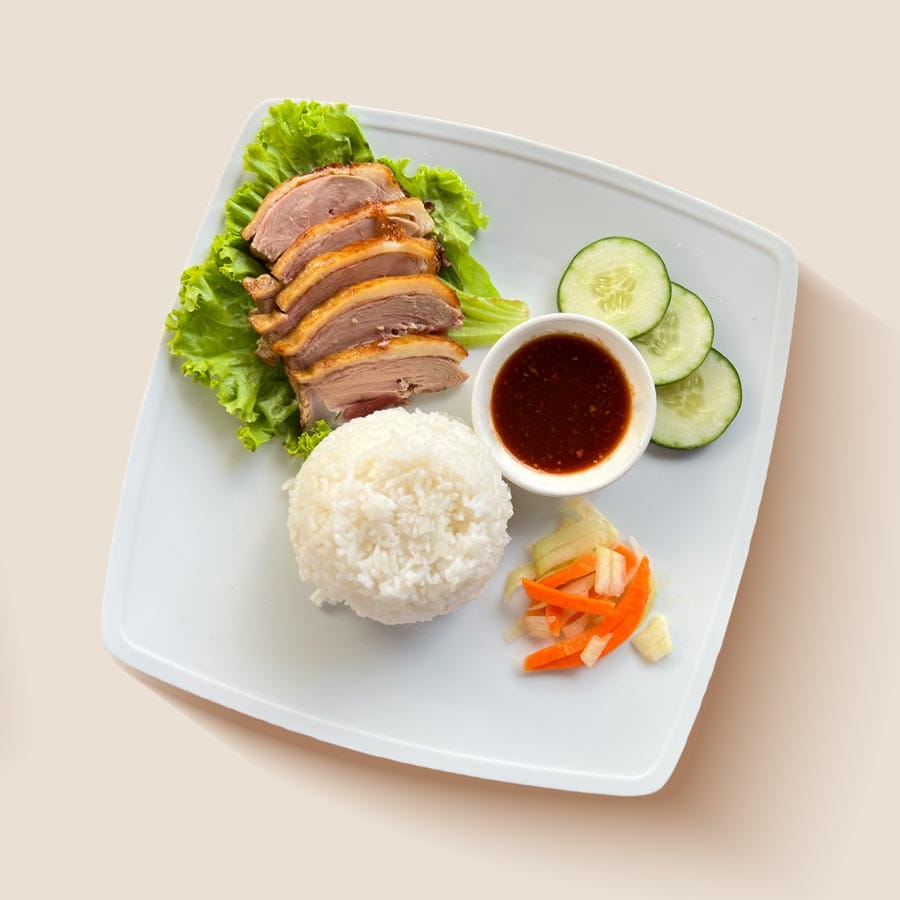 Juicy roasted duck with crispy skin served over jasmine rice, with herbs, pickled veggies, and signature sauce.